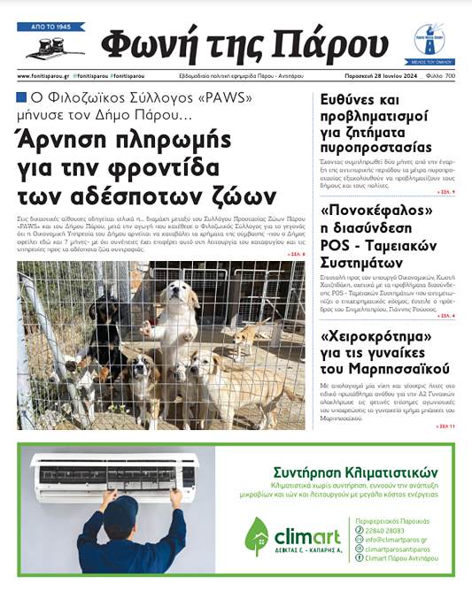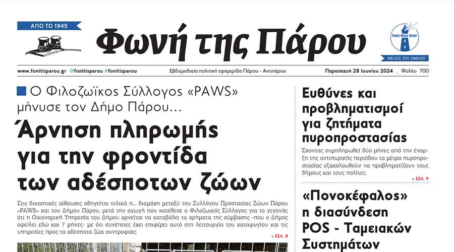 Η «Φωνή της Πάρου» κυκλοφoρεί σήμερα, Παρασκευή 28 Ιουνίου, με 5.000 φύλλα.